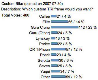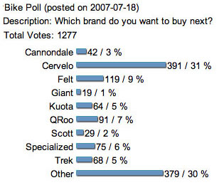 But 3 out of 10 responded that they’ll select a bike other than those from which we gave them to choose. Guru, Litespeed, Orbeea and BMC all did well in this poll. See more about Guru in our poll on custom bikes.