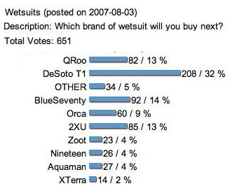 No, it wasn’t QR, or Orca, or Blue Seventy that won, but De Soto’s T1 Wetsuit brand. And it didn’t win by a squeaker. It enjoyed about the same popularity as Cervelo does among tri bike brands. Blue Seventy, QR, and Aquaman, the three venerated tri wetsuit brands accumulated were about equal to T1 in our poll.