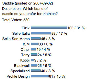 We asked our readers about saddles, and 519 replied that, for triathlon, Fizik is the favorite. If you haven’t seen its Arione Tri II, it’s a nice upgrade from the original Arione Tri. We ourselves did test some of Fizik’s other, more exotic and expensive, saddles, and we had spotty results. With some we had seat post compatibility problems, and some of the carbon-shelled saddles were hard. The Arione Tri II is a great saddle, and almost one out three readers agrees.