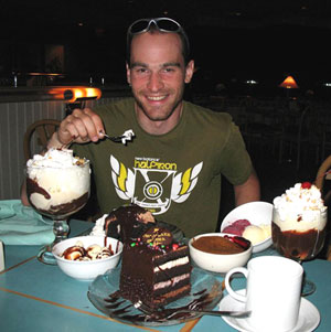 Jonnyo: A few years ago, at a training camp, we were under a very restrictive diet. Our coach was controlling our food intakes (fruit veggies oatmeal and honey only) and he pushes us so far pass the point of starvation that I swam a 15km swim set because he promise bacon if I did it. I finished the set but realized it was a lot of work. So I decided to escape the training house and break the curfew one night and go groceries shopping. I came back with bagels, cookies, butter, cheese cake, chocolate and cereals. I then started selling my treasures to the other athletes who were starving. Every night, they would come to my room and buy a bagel for $3 with the option of butter on it for an additional $1. It was a great time. ☺