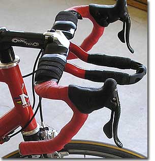 The other product that needs designing is the road bar onto which the shorty bar will mount. I like my hoods turned slightly up, as a brace when I'm braking, or out of the saddle, or riding with my hands on the hoods. This Oval road bar featured here has pre-drilled holes for cable routing, and I can only turn the hoods up so far on the bars or the hood structure covers the holes. So I must tilt the whole bar. When I do so, the "flat" section tilts up a bit. When I affixed a neoprene pad to the tops, to make an armrest, I had to wedge or cant the neoprene to make the armrest level (then I covered it all with a wrap of handlebar tape, for some stiction).