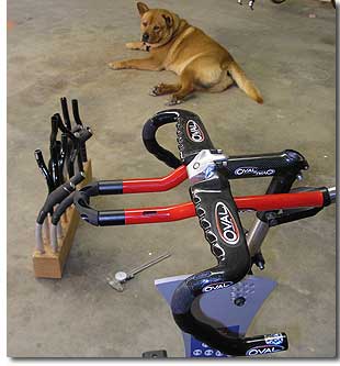 The bar that needs making is the road bar that (like the Oval bar here) takes its cables internally. The tops, however, need to be molded or formed with a sort of armrest trough built into them. Nothing too awfully fancy, perhaps a depression in which the forearms will rest. But these depressions need to be angled so that the elbows can be splayed a bit wider than usual with full aero bars, the hands will be relatively close together. Again, this is in keeping with the ergonomics of this sort of bar, for this sort of riding.