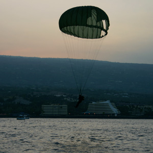 On Saturday, October 11th, Petty Officer David Goggins, Commander Keith Davids, and Captain Duncan Smith parachuted out of the C-130 (bird) and into Kailua-Kona Bay only moments before the professional men and women's race began.