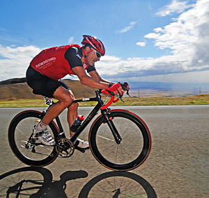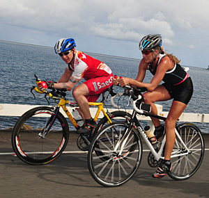 Once the first serious climb of the day started, first day leader O'Keefe was the first to fall back. Then Ajram, a 30-year-old stockbroker who finished 24th of 800 entries in this year's six day Marathon des Sables, and who set the fastest first day bike split here at Ultraman, also fell off the torrid pace set by Ribeiro and Kotland. Just two miles into the first climb, Ribeiro took the lead, which grew from 15 to 30 to 45 seconds and then 2 minutes by Waimea. After climbing the spine of the windswept Kohalas like a mountain goat, Ribeiro charged the steep downhill into the finish like Formula 1 countryman Ayrton Senna and arrived in Hawi with an 8 minute 46 second advantage on the day over Kotland's ride. Ajram arrived 2 minutes 24 seconds later, with O'Keefe another 4 minutes 37 seconds back with the fourth fastest split of the day.