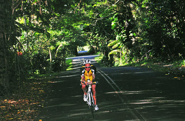 Todd Crandell Executive Director of Racing For Recovery, rides through a tunnel of tropical canopy.