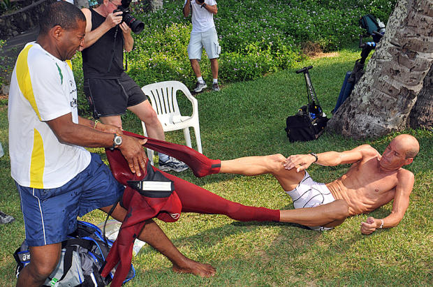 Two-time Ultraman winner Alexandre Ribeiro of Brazil gets help with his wetsuit from crewmember Jose Carlos of Boulder.