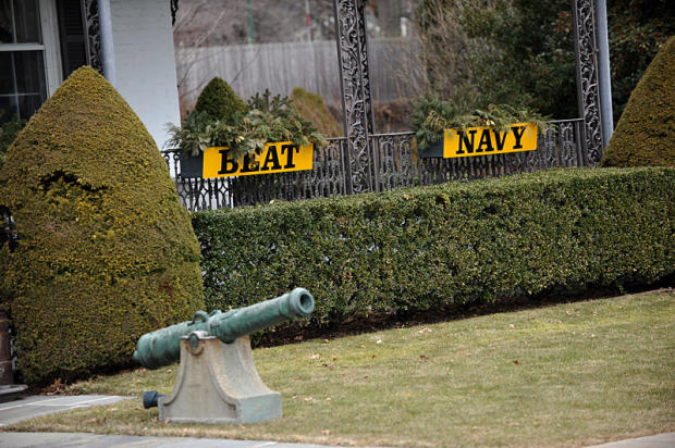 Beat Navy sign outside commandant’s quarters, the oldest building at West Point.