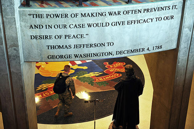 This Thomas Jefferson quote, said to George Washington: “The power of making war often prevents it,” is around the corner from a popular cadet coffee shop.