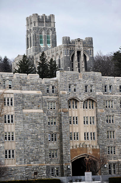 Neogothic barracks and Cadet Chapel looming atop a hill were constructed in the early 20th Century. They are made of granite with a predominant black and gray hue and giving the Academy the look of a medieval castle fortress.