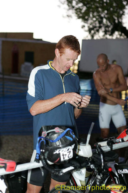 Bryan Rhodes and TJ Tollakson get ready to check out the swim course.