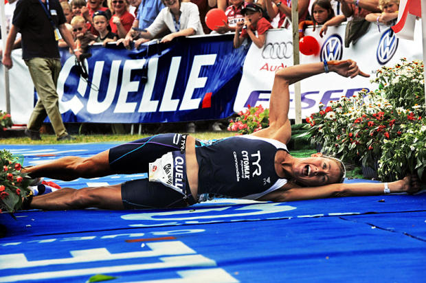 In the past 21 years, this first European Ironman became the stage for some of the most dramatic encounters in the sport of triathlon. It's where Thea Sybesma in 1992 became the first woman to crack the 9-hour barrier, and Paula Newby-Fraser set a women's record of 8:50:53 in 1994 that stood for 14 years. It's where German star Lothar Leder in 1996 became the first man to crack the Ironman 8-hour barrier. It's also the race where in 1997, an epic duel was waged and Belgian star Luc Van Lierde passed Germany'/s Jurgen Zack with 2 kilometers to go in the process of setting a still-standing Iron-distance record of 7:50:27. Zack could console his disappointment with the fact that his second place finish remains the second-fastest men's Iron-distance time ever. To wrap up that incredible year, Lothar Leder took third and Thomas Hellriegel fourth and also broke 8 hours. In 2003, Lothar Leder beat Chris McCormack by three seconds after an Iron-distance race long war that had the crowd at the finish going mad. In 2008, the women took their turn in a mass assault on the old barrier, with four breaking the 9-hour mark and the Netherland's Yvonne Van Vlerken broke Newby-Fraser's old mark and setting a new women's world best of 8:45:48.