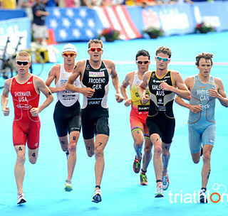 Off the bike, I think I was one third of the field off the lead. I think the fast guys caught those lead guys about 1k into the run and we had the lead before the first of four laps. Then I just stayed with [Gomez, Whitfield, Kahlefeldt, Gemmell and Frodeno] at a very high rate of speed.