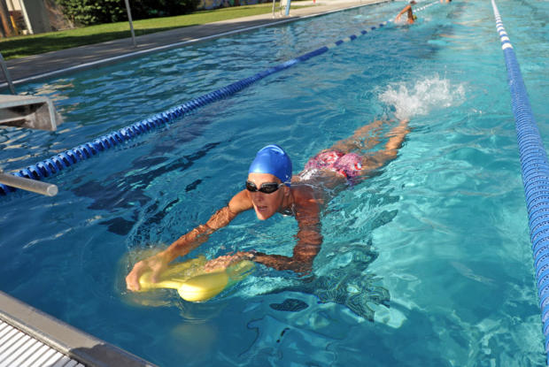 Good friends Belinda Granger and Joanna Lawn look like synchronized swimmers while completing a backstroke set.