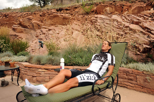 Wednesday August 19, 10:30 AM. Boulder’s Spruce Avenue Pool swim workout. There’s a lot of camaraderie among friends and fellow pros in a 90-minute workout. Left to right: Laura Bennett (obscured), Justin Daerr, Belinda Granger, Armando, Justin Granger, Gordo Byrn.