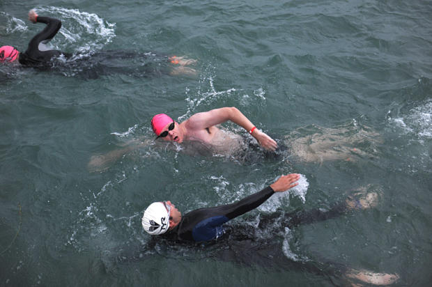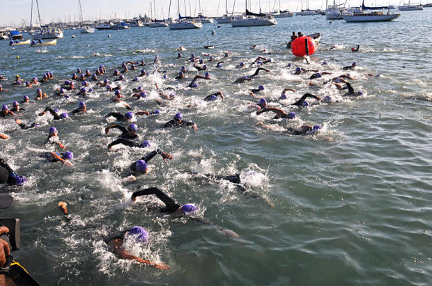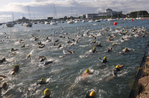 An Olympic distance swim wave heads south toward the museums and aquarium before rounding the buoy for the journey north.