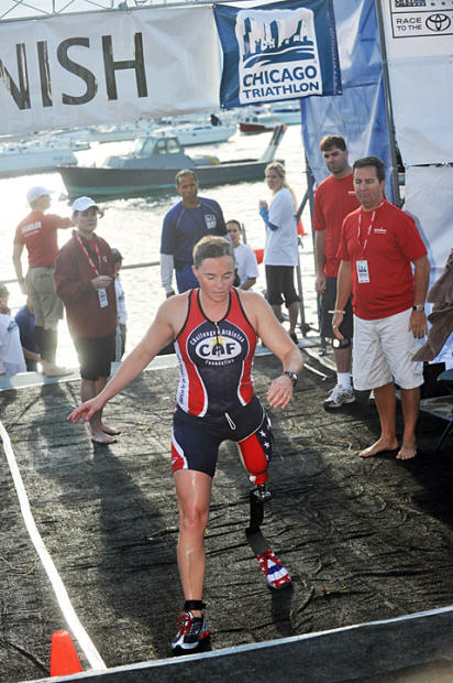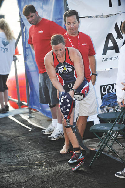 With her specially designed run leg firmly fastened, it’s time to run from the swim to the bike transition area.