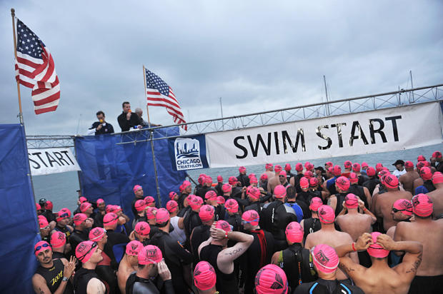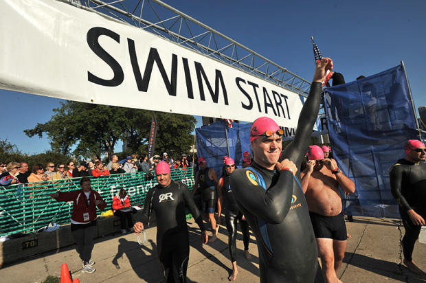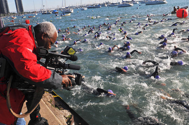 The signature vista of the Chicago Triathlon: Monroe Harbor and a ring of high rise condominiums and office buildings invaded by thousands of triathletes.