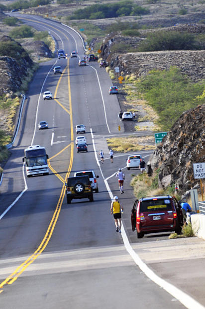 Ultraman runners and support vehicles hop scotch south along the Queen K.