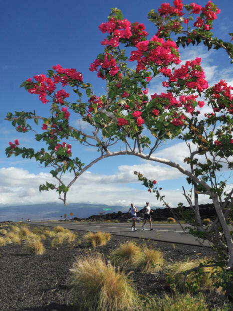Ribeiro and Kregar run in tandem framed by a red bougainvillea in the lava fields on the Queen K.