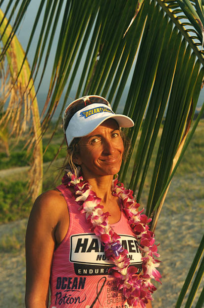 Suzy Degazon manages a wry smile after she wrapped up her 12th straight Ultraman with a 10:44:21 run and a 32:32:19 overall time.