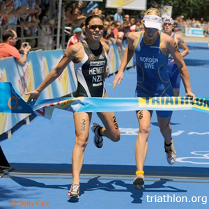 Jodie Stimpson, Debbie Tanner, Helen Jenkins, Nicola Spirig and Lisa Norden led off the bike. Surges late in the run dropped Tanner, Stimpson and Jenkins, leaving Spirig and Norden to fight it out. Spirig attacked with only a couple hundred meters left and crossed the first by a two seconds.