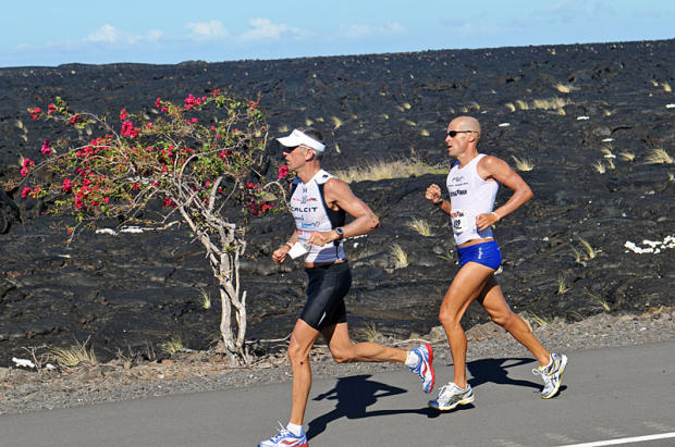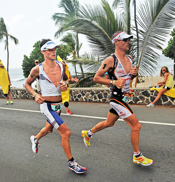 Craig Alexander hooks up for an 8-mile duel with Michael Raelert midway through the run at Kona. Overgrown bananas outside aid stations not regulation nutrition.