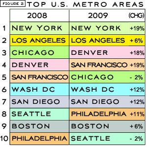 In FIGURE 2 we've normalized these percentages for our year-over-year growth in readership, just to see the shift in where our readers are coming from. New York City, considered as a metro area (which would take in Westchester County, Northern New Jersey, Long Island, perhaps some of Connecticut), is the largest metro concentration of Slowtwitchers. It also became larger yet in 2009 versus 2008, as it grew by 19% for us relative to our overall readership.