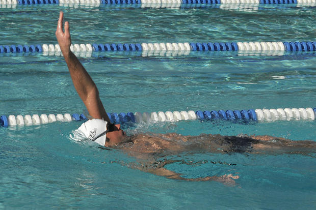 Fast lane swimmers try to stay warm before a set.