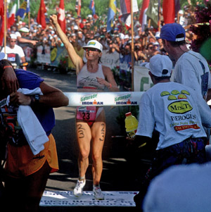 As Bob Babbitt put it so well, Paula Newby-Fraser changed the perception of what a female endurance athlete could accomplish. The 23-year-old from South Africa was the first woman to go under 10 hours with her 9:49:14 winning time at Kona in 1986. She shocked the world of endurance sport when she took 11th overall including the men and smashed the course record by 34 minutes when she won with an amazing 9:01:01 time in 1988. In 1992, she won her 5th Ironman Hawaii with a course record time of 8:55:28 — a record which stood for 17 years until Chrissie Wellington broke it this October. After a spectacular collapse in the final mile at Kona in 1995, Newby-Fraser came back in 1996 with her smartest race ever to win an unmatched 8th Kona title – two more than Dave Scott, Mark Allen and Natascha Badmann. Her grand total of 24 Ironman victories is nearly twice as many as the 15 wins earned by her closest challenger and good friend Heather Fuhr.