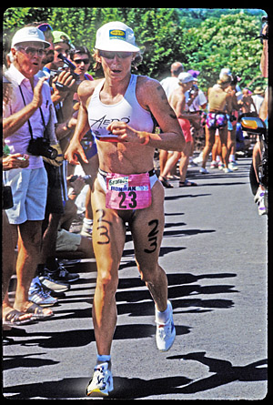 Paula: I was certainly surprised that she ran as poorly as she did [Newby-Fraser ran 3:16:24 to break 9 hours and win by 10 minutes; Baker ran 3:19:12 – 15 minutes off her 1990 course record marathon]. She had a shot that year because there was nothing stellar about the way I was running. I just remembered I had a total of 5 weeks of running since May.