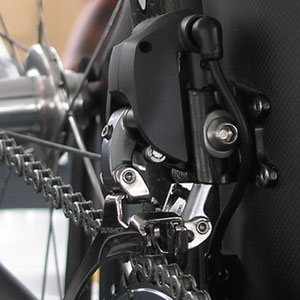 The DA's new rear caliper sits underneath the chain stay, and that stay's mold is depressed to make room for the brake. Very sexy.