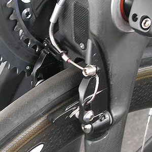 I rather prefer this brake set-up: rear caliper hidden down there, front caliper in front of the crown. This, because hiding the front caliper behind the crown is high-risk, low-reward. I've found that the front brake doesn't stop as well on these behind-the-crown mounts. But the rear, yes, get it out of the way of the air. The rear doesn't contribute that much to stopping power, but cleaning up that seat cluster is an aerodynamic imperative these days.