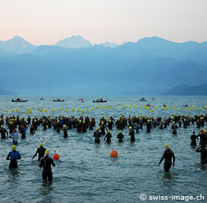 Enjoying the only "flat" section of the infamous Inferno Triathlon, German Elmar Schneider was first out of the Thunersee in 46:17, with Swiss Manuel Ribeli about 20 seconds adrift and most of the favorites 2 minutes or more behind the very early leader.