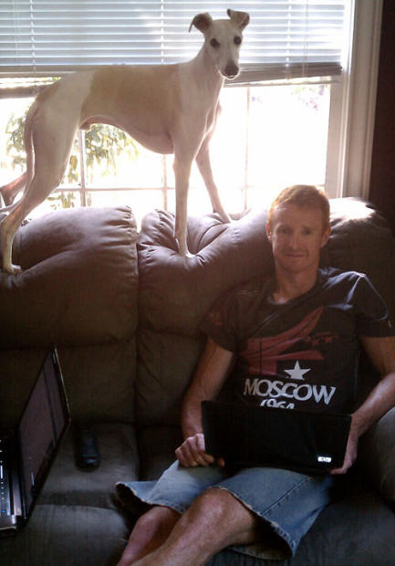 Sam, the 2 ½ yr old whippet of Richie Cunningham stand his ground above his very relaxed owner.