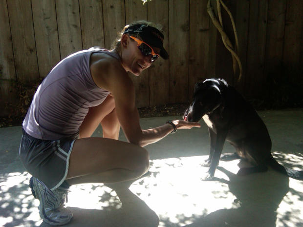 Kaisley licking ice cubes after a run with her owner Kate Major. Kaisley is about 2 ½-3 years old and that is all Kate knows about the dog given to them around Easter by a friend.