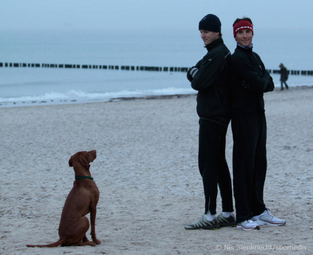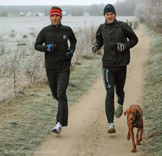 Michael Raelert and his brother Andreas with Jenna, Michael’s 2-year old Magyar Viszla during a training run.