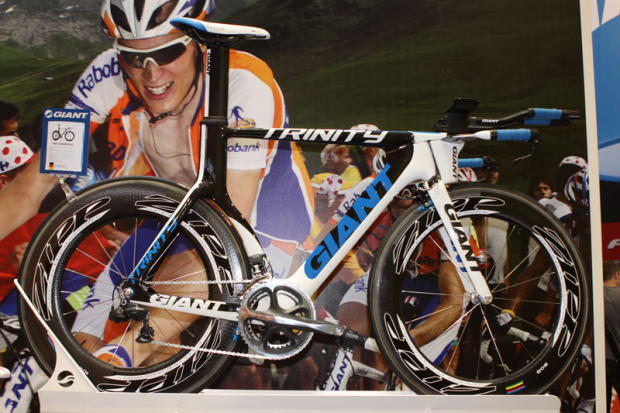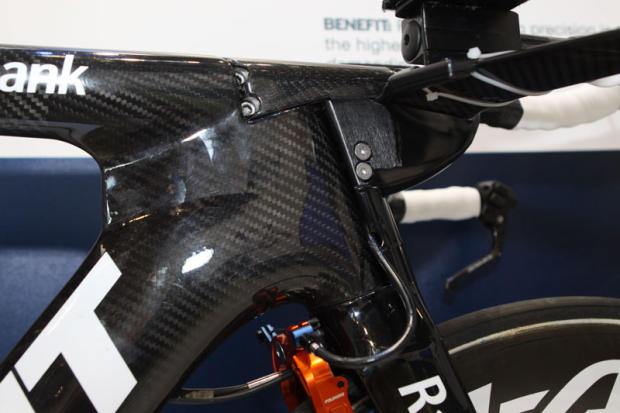 The bike of Denis Menchov features the UCI legal adjusted front end.