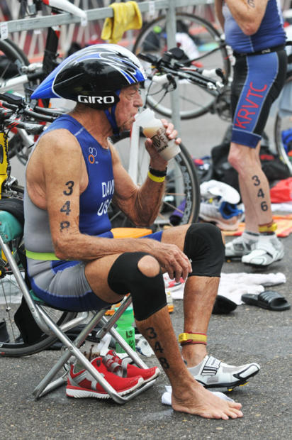 Dean Davis, 81, of Ft. Meyers, Florida hydrates before starting the bike. Davis won 80-84 with a 2:02:05 finish.