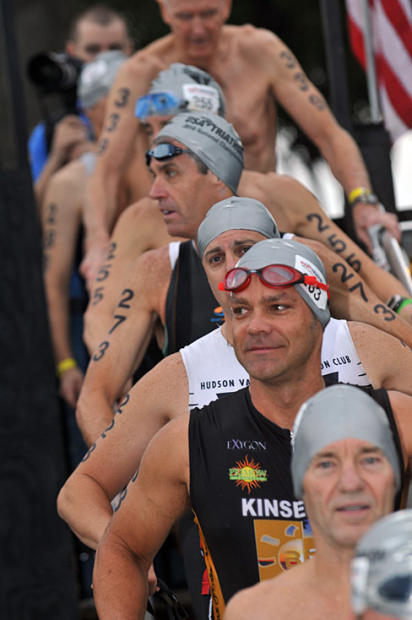 Kimberly Dunker, 27, of Athens Georgia does an elegant stretch before the swim. The stretches must have helped — she finished 2nd in women’s 25-29 in 1:12:40.