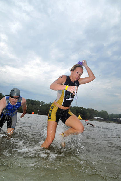 Woman charges out of the water on her way to the swim-bike transition.