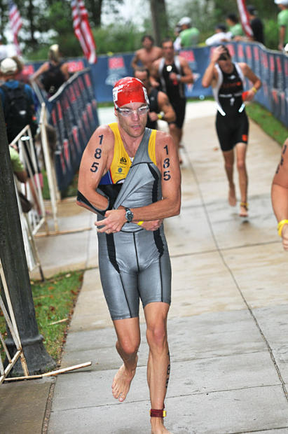 James Smith, 37, of Washington Township, Pennsylvania takes off his swim suit on the way to T1. Smith won men’s 35-39 in 1:05:51.
