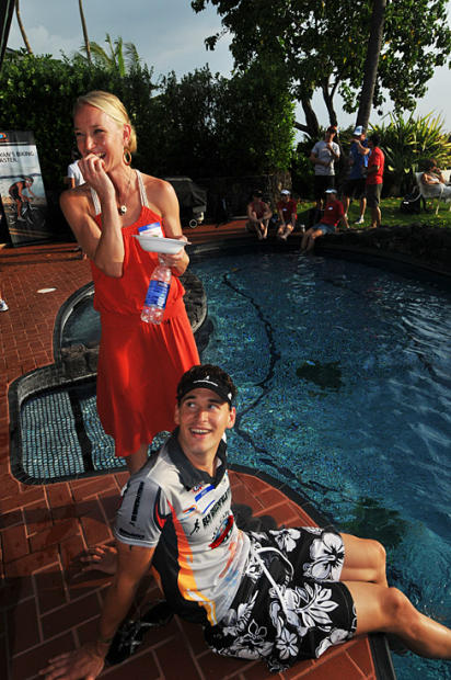 Mathias Hecht sports stylish compression socks, Nicole Hofer sports stylish legs.