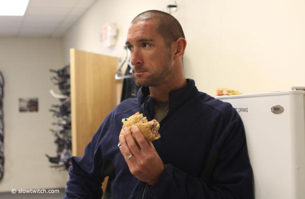 A roast beef sandwich gives strength before it is time to go back in the tunnel.