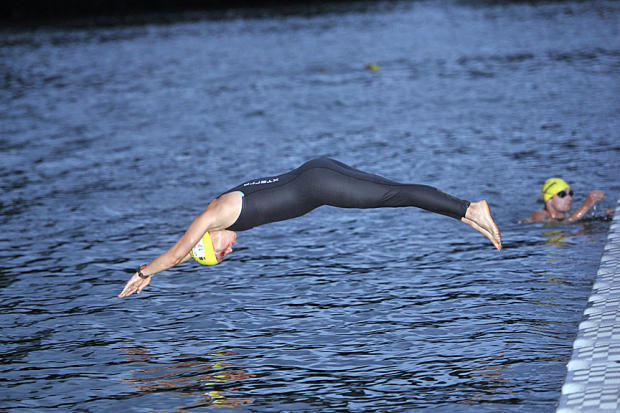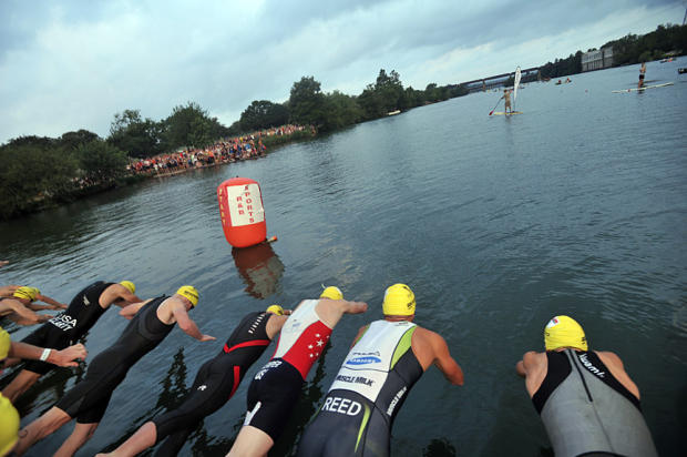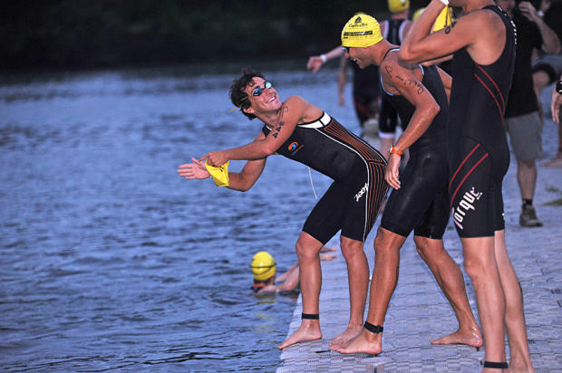The ultimate bill for restoring the soaked photo equipment up to specs? Unknown. The moment when the swim start PA announcer encouraged the crowd to cheer this dripping wet photog for his style points? Priceless.