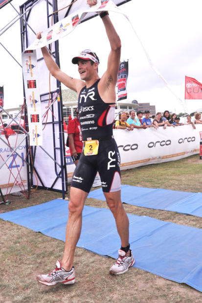 That's sad because Sarah Haskins had a great world-class winning performance that included a race-best 1:02:47 bike and Andy Potts combined a runaway swim, a 6th-best 58:34 bike and 4th-best 32:58 run to take the title, holding off by 13 seconds a race-best 31:16 run by his long time rival Hunter Kemper for the win. Which would have been a fine, happy script — except that that scenario will forever be overshadowed by the strange swim marshaling snafu. Somehow, misinformed persons piloting a jet ski and another in a larger boat zoomed in front of the leading swimmers as they were on course and approaching the first turnaround buoy. The bad news boats frantically misdirected the pack — literally stopping all the swimmers but one in their tracks. Andy Potts instead went around the hijacking and for his presence of mind got a 3 minute advantage which held up right to the end.