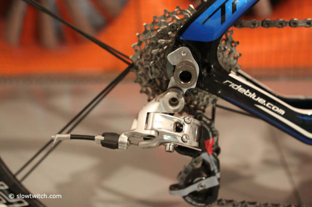 Without the derailleur cable in place Mike Giraud uses this gadget to set up a specific gear.