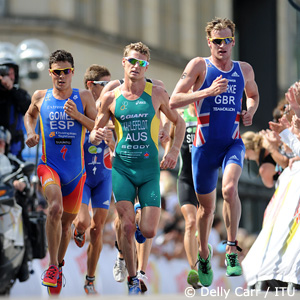 Tony Moulai emerged first from transition and went out on the run closely followed by a huge pack, but that group soon dwindled down to about 10 athletes. Brad Kahlefeldt, David Hauss, Will Clarke, Reto Hug, Javier Gomez and Kris Gemmell were in that lead pack, but Gemmell had collected a penalty at some point earlier and had to serve a 15 second stand down. At about that time Sven Riederer could no longer hold the pace and fell away from the leaders. With 5k to go it was now down to Gomez, Kahlefeldt, Clarke, Hauss, Sebastian Rank and Joao Silva to go for the win. Gomez went to the front to set the pace with about 2.5k to go but the others were hanging very tough.