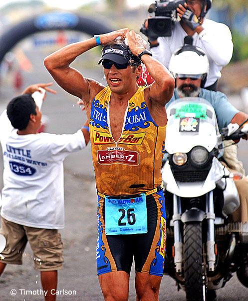 A clearly elated Normann Stadler takes his first Ironman World Championship title in 2004.