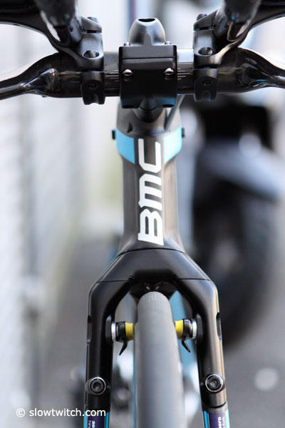 The Timemachine TM01 comes in 4 different sizes, small, medium short, medium long and large – and with the very clever integrated stem system it is possible to have up to 32 different stem configurations. Standard seat tube angle is 77 degrees but Andreas Raelert rides his closer to 82 and some of the BMC Pro Tour Team as slack as 73 degrees according BMC product manager road Andrew James.