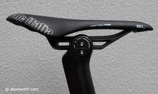 The bike was designed with the Omega Pharma Pro Tour team in mind and will apparently be available in 3 sizes – small, medium and large. The bike we saw in Friedrichshafen was built around a 73 degree seat angle, but we were told that an additional 3 sizes are in the works with triathletes in mind. The bike we are featuring here has been somewhat under wraps at the show, with only the white puzzle test bike inside a glass showcase, but owner Roman Arnold let us spend a few minutes with the black stealth one.